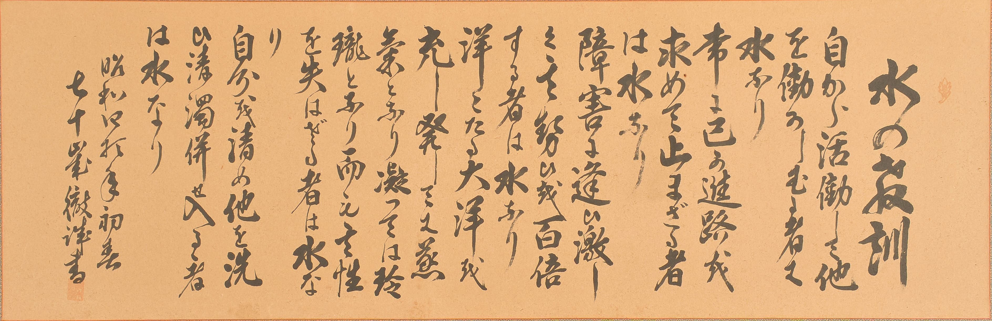 「水の如く」への繋がりは、私が修行中の植木邸にあり、師匠植木等の尊父:植木徹誠氏が揮毫された、黒田如水「水五訓」にふかく感銘を受けたことによります。水は与えられた条件により液体、固体、気体へと姿を変えながら人に要され、また、なくてはならない生命の源でもあります。